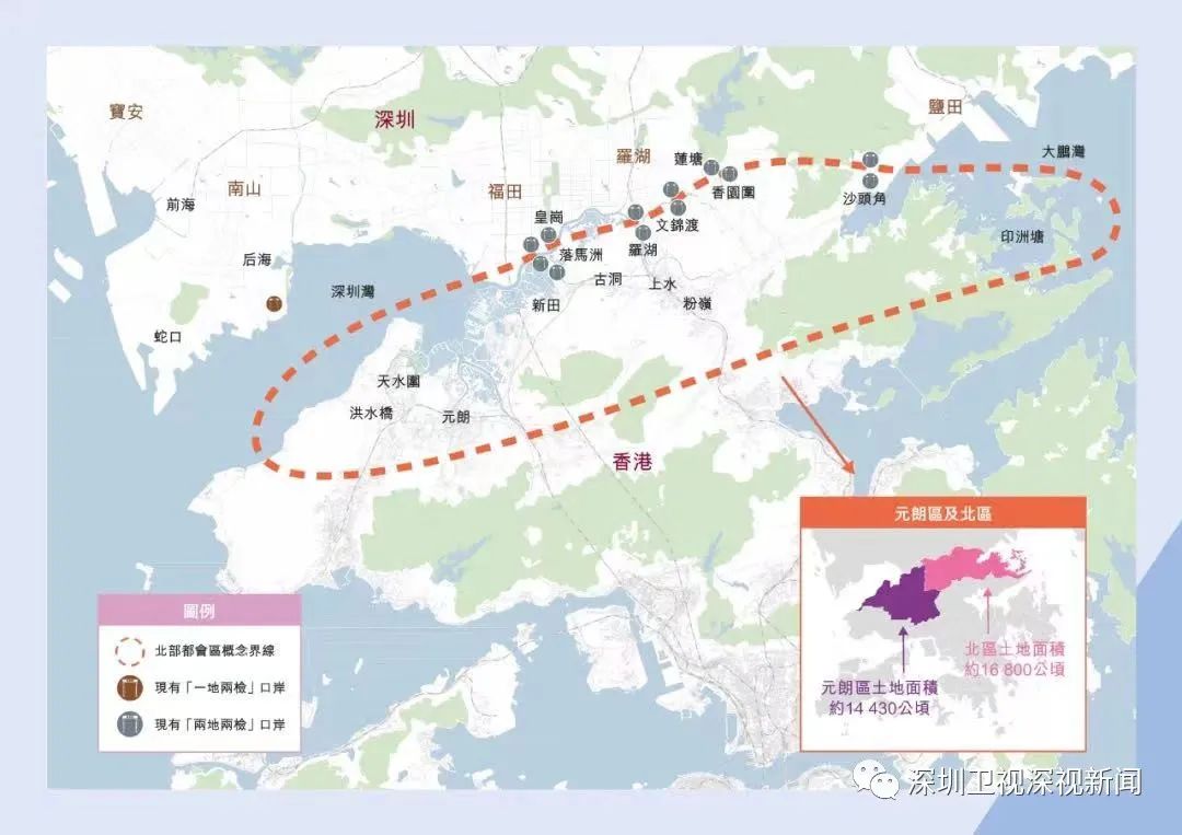 從地圖上可以一眼看出,深圳的中心城區(qū),就在香港“北部都會區(qū)”的對面。這里擁有多達七個跨境陸路口岸,未來預計可容納約250萬人居住,提供65萬個工作崗位。