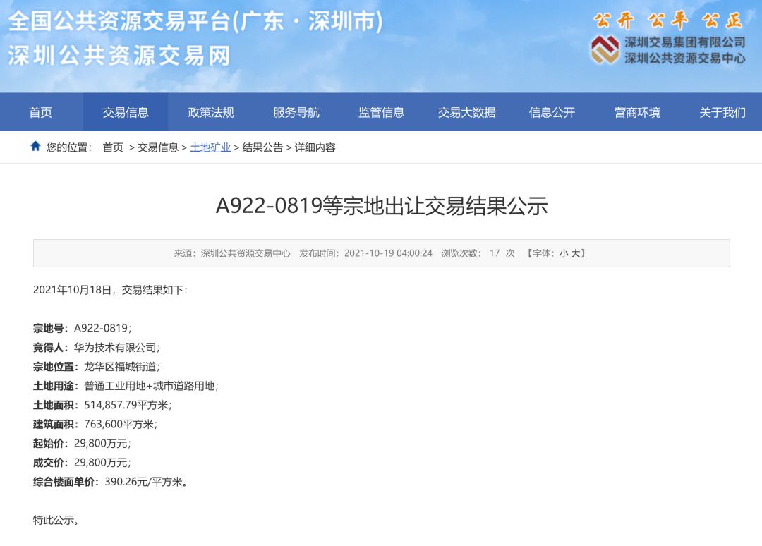 10月19日,據(jù)深圳公共資源交易中心網(wǎng)站顯示,華為以底價(jià)2.98億拿下位于龍華區(qū)的一塊普通工業(yè)用地,土地面積514857.79平方米,建筑面積763600平方米。相關(guān)信息顯示,該地塊用途為普通工業(yè)用地+城市道路用地,準(zhǔn)入行業(yè)類別為A02新能源產(chǎn)業(yè)、A06新一代信息技術(shù)產(chǎn)業(yè)。
