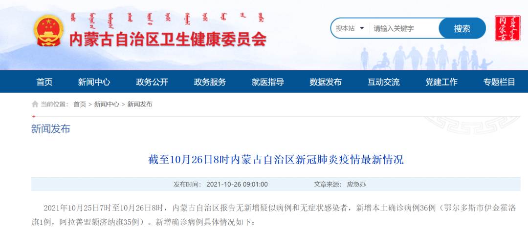 內(nèi)蒙古衛(wèi)健委通報(bào),2021年10月25日7時(shí)至10月26日8時(shí),內(nèi)蒙古自治區(qū)報(bào)告無新增疑似病例和無癥狀感染者,新增本土確診病例36例(鄂爾多斯市伊金霍洛旗1例,阿拉善盟額濟(jì)納旗35例)。