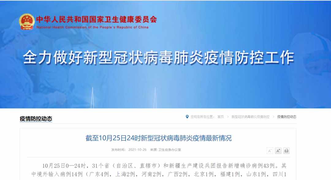 據(jù)國家衛(wèi)健委消息,10月25日0—24時(shí),31個(gè)?。ㄗ灾螀^(qū)、直轄市)和新疆生產(chǎn)建設(shè)兵團(tuán)報(bào)告新增確診病例43例。