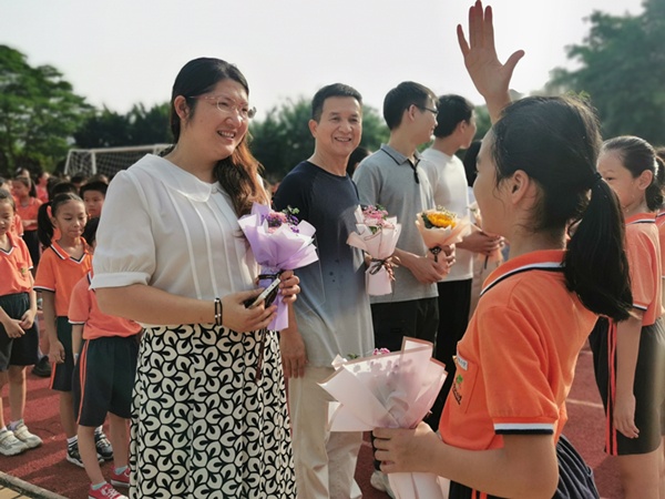 9月10日清晨,開發(fā)區(qū)中心小學在升旗臺前舉行感懷師恩的活動。莊嚴肅穆的升旗儀式之后,少先隊員代表配樂朗誦《感恩的心》,深情獻唱,致敬園丁。在《每當我走過老師窗前》優(yōu)美抒情的旋律中,一個個佩戴著紅領巾的少先隊員們,有序地向全體教師獻花,致以老師真誠的節(jié)日祝福。陽光下,閃耀著的不僅是高高飄揚的紅旗,更有老師和學生那一張張喜悅的笑臉。
