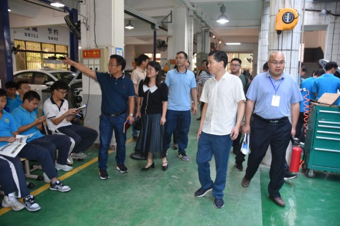 考察團首先走進學(xué)校汽車技術(shù)部的實訓(xùn)場室,觀摩師生上課實操,與師生交流有關(guān)于專業(yè)教學(xué)的設(shè)施設(shè)備、課程內(nèi)容、考核標(biāo)準(zhǔn)等具體內(nèi)容;參觀學(xué)校與企業(yè)合作的汽車維修中心,詢問校企合作的運行機制、運作流程??疾靾F還走進節(jié)能與興能源汽車公共實訓(xùn)基地,了解基地內(nèi)環(huán)境、人員和設(shè)備等情況,感受正在建設(shè)廣東省雙高專業(yè)的新能源汽車維修專業(yè)群的新進展。