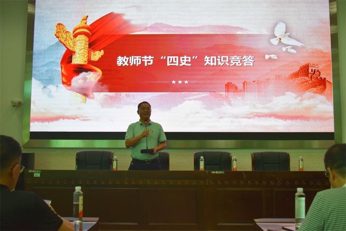 隨后,黨建辦公室胡忠林主任組織全體教師進行教師節(jié)“四史”知識競答,用這種有意義、有趣味的方式來慶祝教師的節(jié)日。老師們踴躍積極,競相打卡答題,全場氣氛緊張而又熱烈。