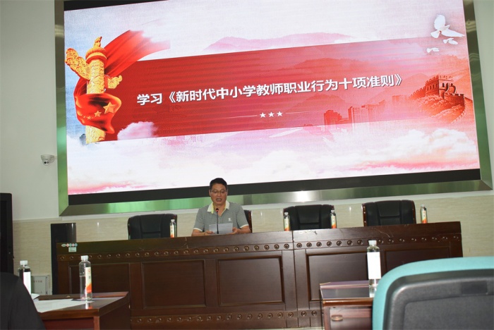 王劍勤副校長為全體教師深度解讀《新時代中小學教師職業(yè)行為十項準則》。王副校長要求全體教師要認真學習、貫徹、落實好準則精神,并以此為準則,規(guī)范教師職業(yè)行為,明確教師道德底線,維護教師職業(yè)形象,爭做新時代的“四有”好教師。