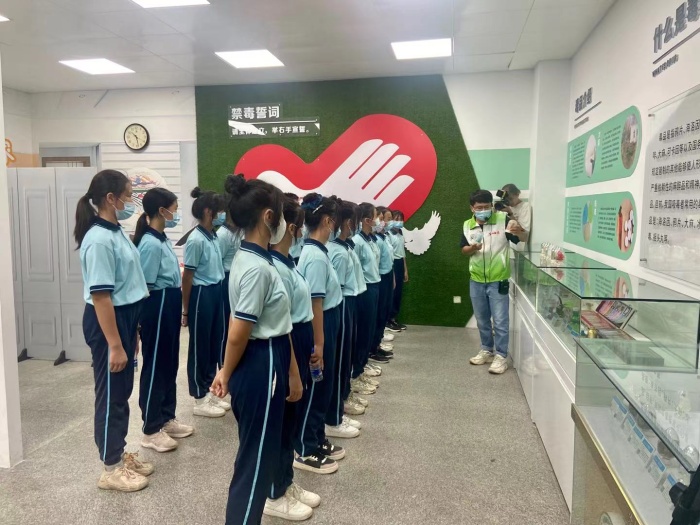 接著,同學(xué)們在禁毒辦梁社工的帶領(lǐng)下,來到模擬KTV、監(jiān)獄實(shí)地等感受吸毒帶來的巨大危害。隨后,全體同學(xué)進(jìn)行禁毒宣誓,堅決牢記歷史使命,弘揚(yáng)硝煙精神,自覺抵制毒品誘惑。最后,全體學(xué)生觀看禁毒視頻,直觀、詳實(shí)的內(nèi)容介紹,讓孩子們更加直觀地了解毒品以及吸食毒品帶來的危害性。